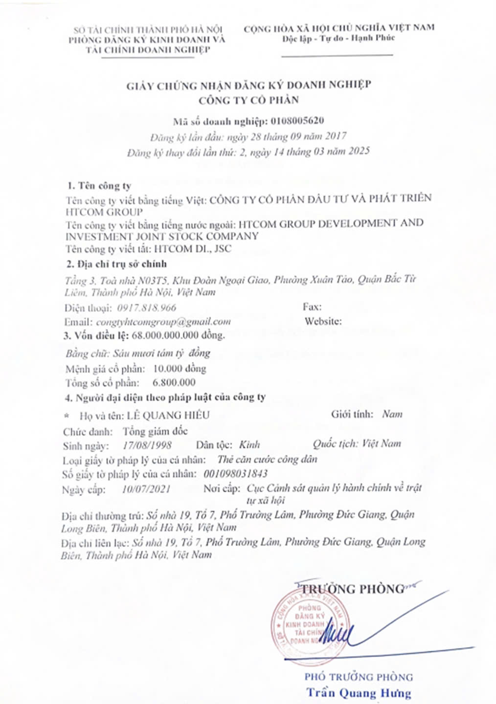 Giấy chứng nhận đăng ký doanh nghiệp công ty cổ phầnTác giảhtcomgroup00:01 - 10/05/2025GIẤY CHỨNG NHẬN ĐĂNG KÝ DOANH NGHIỆP CÔNG TY CỔ PHẦN HTCOM GROUP Chia sẻ: